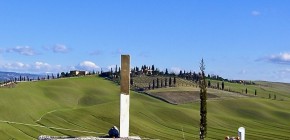 An unmistakable golden stele is outside a curve just before the farmhouse “Mezzavi...