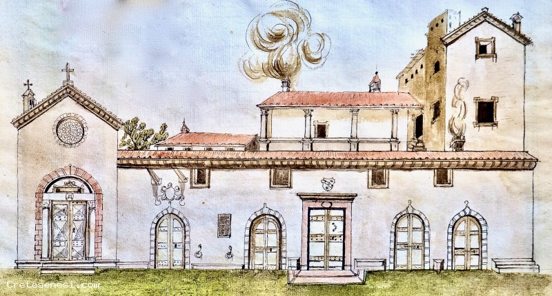 Questa immagine acquarellata, proviene dal Cabreo (inventario dei beni di proprietà dell'Ordine) redatto nel 1622 e ci regala una testimonianza sorprendentemente bella dell'intero isolato urbano occupato dal convento e l'annessa chiesa di San Giovanni, oggi conosciuta come San Bernardino.