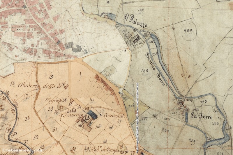 Estratto catastale dello storico reso disponibile dalla Regione Toscana. la mappa è frutto di assemblaggio di fogli diversi fatto in maniera approssimata e quindi non molto precisa.