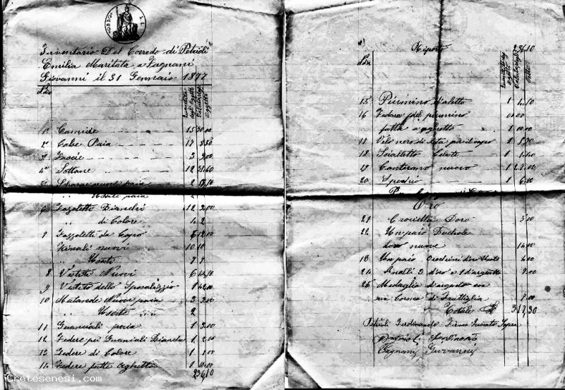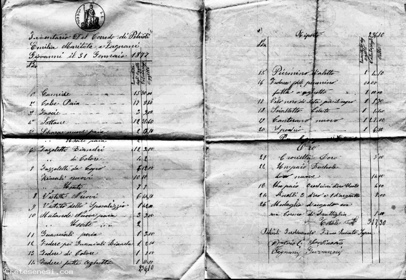 1877, Mercoledì 31 Gennaio - Matrimonio Emilia Petrioli, inventario della dote personale Asciano