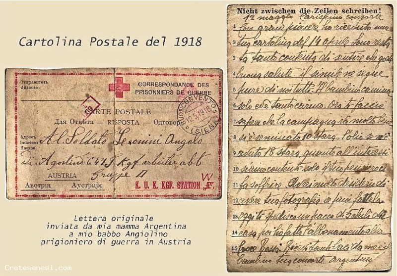 Eccezionale documento da salvare, prima che vada perduto. Si tratta di una lettera, o meglio di una cartolina postale, inviata dalla mamma di Aldo Leonini al marito che combattendo al fronte nella Prima Guerra Mondiale era stato catturato dagli austriaci e recluso in un campo di prigionia. Circostanza paradossalmente fortunata, visto che proprio per essere stato catturato, il padre di Aldo è sopravvissuto e ha poi potuto tornare a casa alla fine della Grande Guerra. Infatti, i pochi fortunati tornati a casa dai campi di battaglia lo devono al congedo conseguente a un ferimento grave o all'essere sopravvissuti nei campi di prigionia. Gli altri sono tutti morti sui campi di battaglia e spesso non sono stati recuperati neppure i loro resti mortali.