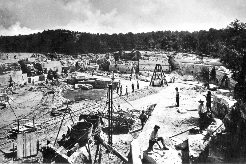 Questa foto, che risale al 1929, rappresenta efficacemente l'attività estrattiva su banchi di travertino superficiali. Allora si lavorava ancora con cunei e mazze per distaccare un blocco di pietra da una parete, in maniera poco dissimile da quello che avevano fatto in passato Etruschi e Romani. L'unica variante vera era l'uso di carrelli su rotaia per il trasporto dei grandi blocchi fuori dalla trincea.