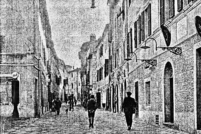 Bella foto del Corso partendo dalla piazza. Oltre al birillo della benzina “Shell” gestito dai fratelli Sabatini, si notano una serie di negozi dotati di robusti portoni in legno. Le saracinesche non esistevano ancora.