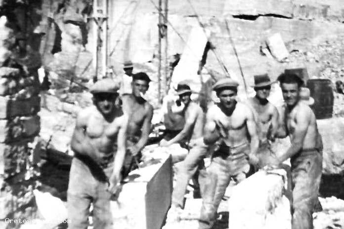 Gruppo di Scalpellini impegnati a sbozzare blocchi di travertino direttamente in trincea.