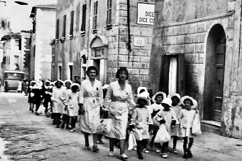 Questa foto che ritrae due insegnanti della colonia estiva mentre portano in giro per il paese i bambini, ci regala uno spaccato di vita risalente al 1938.