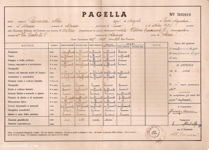 1938 - Pagella di V elementare, dopo l'esame Asciano