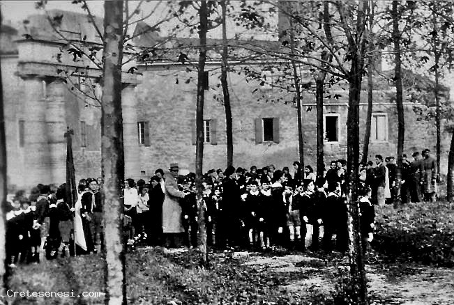 In questa immagine è ritratta una cerimonia commemorativa svoltasi all’interno del Parco della Rimembranza. L’ufficialità della cerimonia è testimoniata dalle divise indossate da molti ragazzi. Tra gli adulti è presente il Maestro Fiorini con impermeabile e cappello. Sullo sfondo la Porta Massini e i locali parrocchiali.