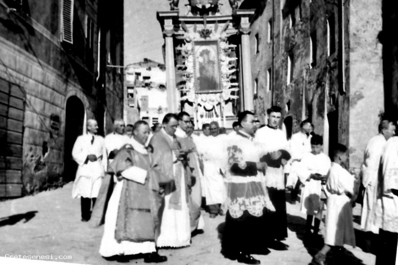 Fra le persone in processione, sembra di riconoscere un giovane don Bruno Torpigliani davanti a don Caramelli, proposto di Sant'Agata