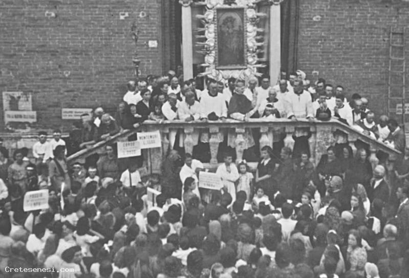 Per la datazione attribuita ci siamo basati sul tentativo di riconoscimento di alcuni personaggi. In particolare, il sacerdote che compare a sinistra del vescovo sembra essere il proposto Caramelli che subito dopo guerra fu sostituito da don Angelo Sadotti.