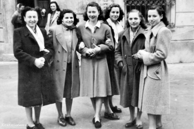 Gruppo di ragazze a passeggio si lasciano fotografare davanti al Palazzo Capitani, vicino a Sant'Agostino.