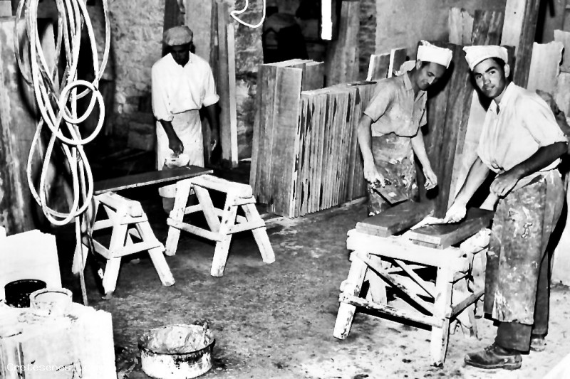 Le lastre utilizzate, dopo essere state tagliate e rifilate a misura, venivano stuccate e preparate per la lucidatura finale.