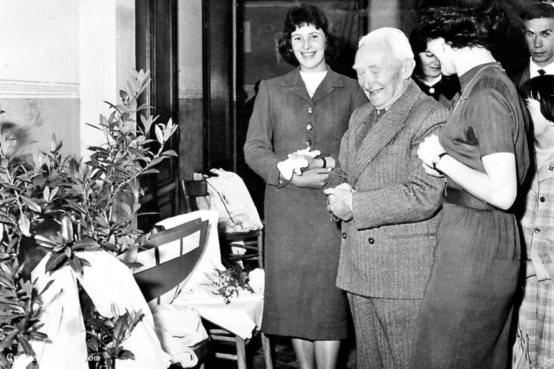 Il direttore didattico di allora circondato da due belle allieve della scuola di cucito, che gli illustrano i capi realizzati ed esposti a fine corso.