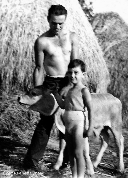 Mentre nella foto si riconosce facilmente il "Biondo", all'anagrafe Tarciso Tommasi, risulta difficile individuare il bambino in mutande che regge il vitello per un corno.