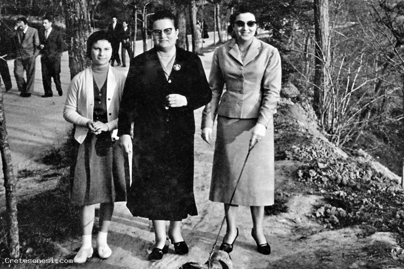 Negli anni cinquanta e sessanta, passeggiare al sole lungo questa nuova strada, che dal centro storico portava verso Trequanda e San Giovanni d'Asso, era una moda molto diffusa, specie nei giorni festivi. Che la foto sia stata scattata un giorno di festa, è confermato dagli abiti delle persone, abiti della festa.
