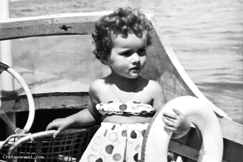 Antonella Gallorini al mare a Follonica, immortalata su un motoscafo di legno come erano allora, pronta per una gita in mare, ma con la sua ciambella di salvataggio ben stretta.