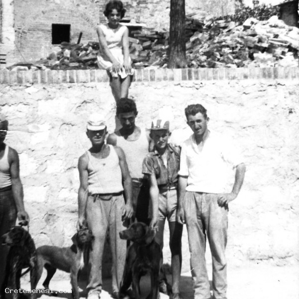 In campagna, ogni podere aveva una concimaia che, se realizzata in muratura, tratteneva il percolato con il quale si usava concimare l'orto dietro casa. Il materiale rimasto solido dopo un periodo di macerazione, veniva usato per concimare i campi. In concimaia finivano le lettiere delle stalle, tutti i residui organici derivanti da potature e tutti gli avanzi del cibo consumato dai contadini. In questa immagine, scattata al termine della costruzione di una nuova concimaia al podere Il Moro, vicino a Montefiori. Le persone riconosciute: Rosanna Magini, seduta sul muretto I muratori di professione: Donato Turchi e suo babbo Giuliano Magini e Urbano Magini facenti parte della famiglia che gestiva il podere.
