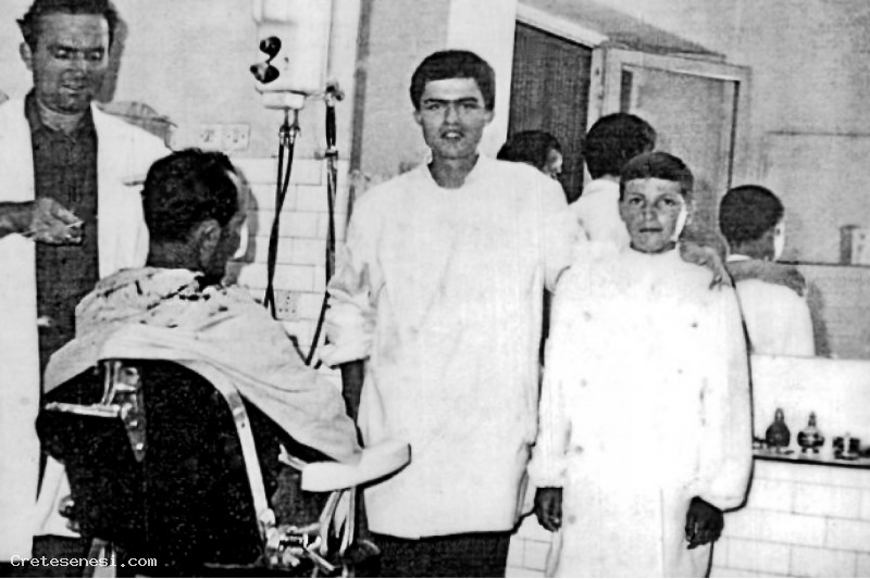 Angiolino Equatori, il Barbiere arrivato da Camucia e appassionato suonatore di mandolino; qui ritratto al lavoro con il figlio Giorgio, ed un altro apprendista, Luciano Neri figlio maggiore di Vasco.