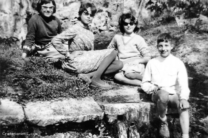 Annamaria Francalanci, con il fratello minore, Serenella Cantini e un'altra amica non riconosciuta, sedute sopra la sorgente di Grottoli.