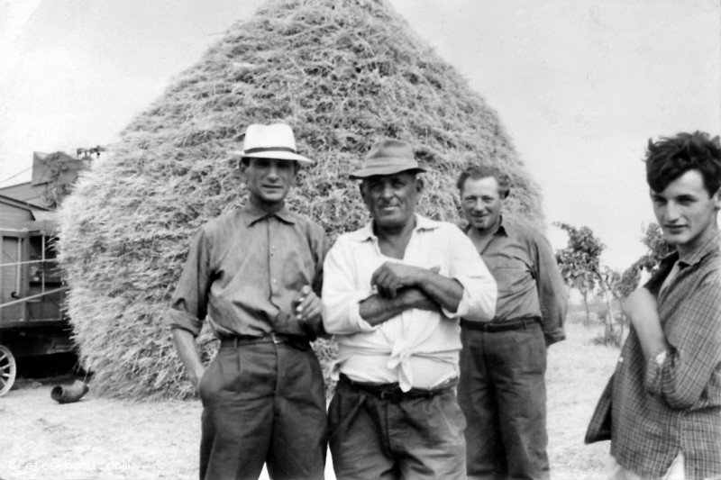 Le persone riconosciute che partecipano alla tribbiatura fatta ancora nell'aia con la tribbiatrice alimtata tramite cinghia collegata a un trattore: