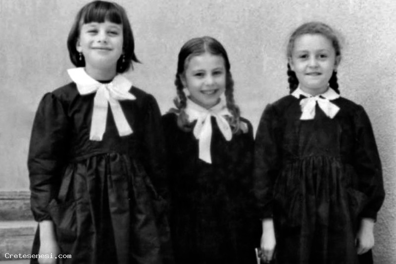 Ritratto di tre compagne di classe sulle scale di accesso alle nuove Scuole Elementari di via San Francesco, 1.