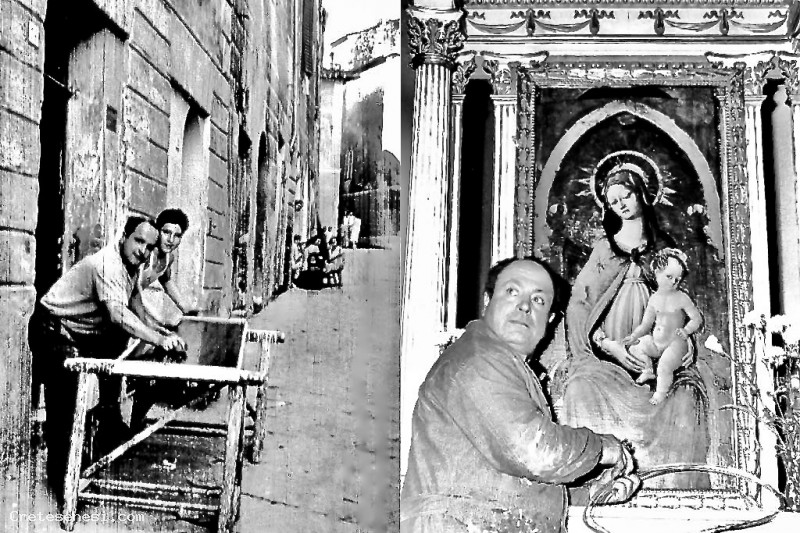 Nelle due foto è ripreso a lucidare la parete di un armadio insieme al figlio e a riparare il baldacchino processionario della "Madonna delle Grazie".