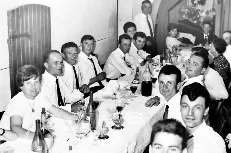 Un gruppo di parenti e amici degli sposi allegramente seduti a tavola all'interno della Trattoria Cannelli, come allora si chiamava l'attuale Ristorante La Mencia.