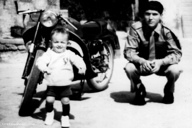 Alberto Tognaccini in divisa militare con il nipotino: Fabrizio Barbagli di poco più di un anno, fotografati accanto alla sua moto, nell'aia del Palazzo.