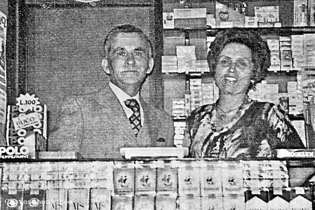 Silvio Fattori con la moglie Alba dietro il banco della rivendita di “Sali e Tabacchi” che si trovava proprio davanti alla Pianella, dove oggi c'è la nuova Gelateria di Gianluca.