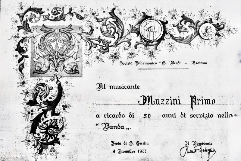 Primo Mazzini, il destintario dell'attestato, a quella data, aveva svolto la sua attività volontaria di musicante per oltre 50 anni in maniera continuativa, all'interno della locale Filrmonica Giuseppe Verdi.