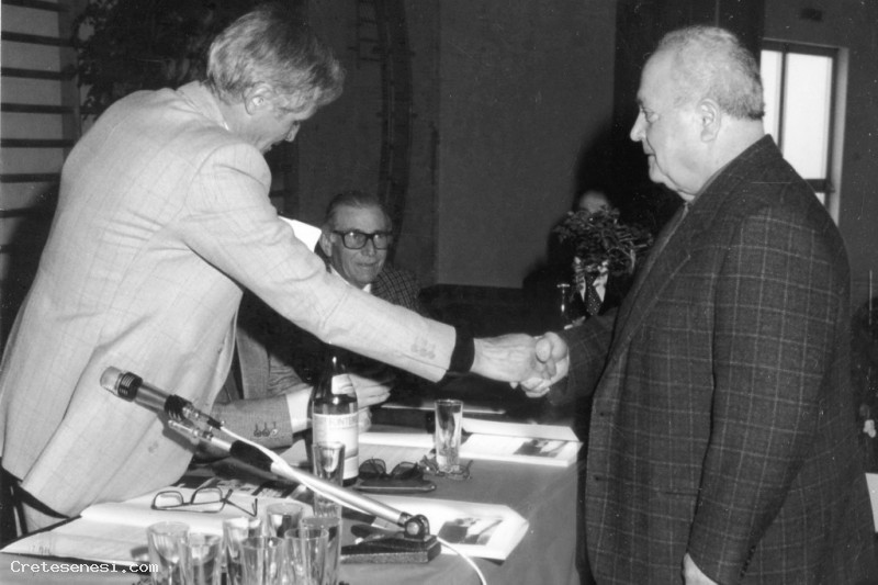 Dario Roncucci, soprannominato Porsenna, riceve un riconoscimento dal presidente della Cassa Rurale e Artigiana di Asciano, Mario Maffei. Sullo sfondo il maestro Marino Tommasi, a lungo consigliere e poi presidente di Bancasciano