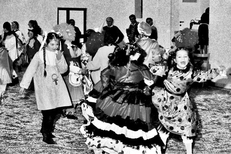 Foto di scolari delle Elementari che festeggiano il carnevale nella palestra della scuola. Una delle due ragazzette riprese sembrerebbe essere Elena Lorenzoni,