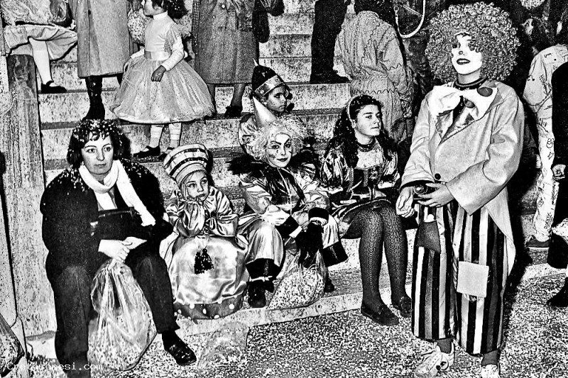 Mamme e bambine al carnevale di Meio, durante una pausa prima di ripartire per un'altra battaglia a suon di coriandoli.