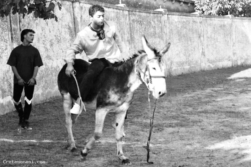 Floriano Tozzi sul ciuco del Corso in occasione del Palio. Dietro s'intravede la figura di Giacomo Equatori.
