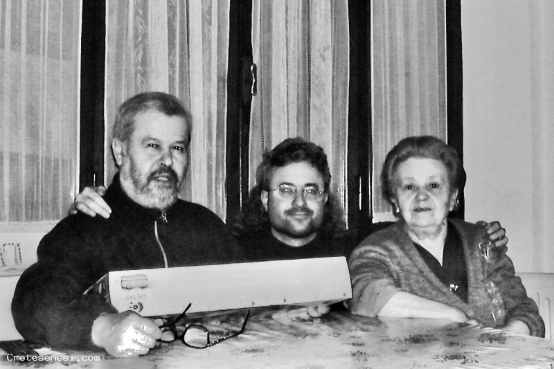 Giorgio Romi, il primo a sinistra, viene festeggiato come di consueto in casa della mamma. Accanto a lui il figlio Guido che, per l'occasione gli ha regalato tastiera e mouse senza fili per l'uso del computer.