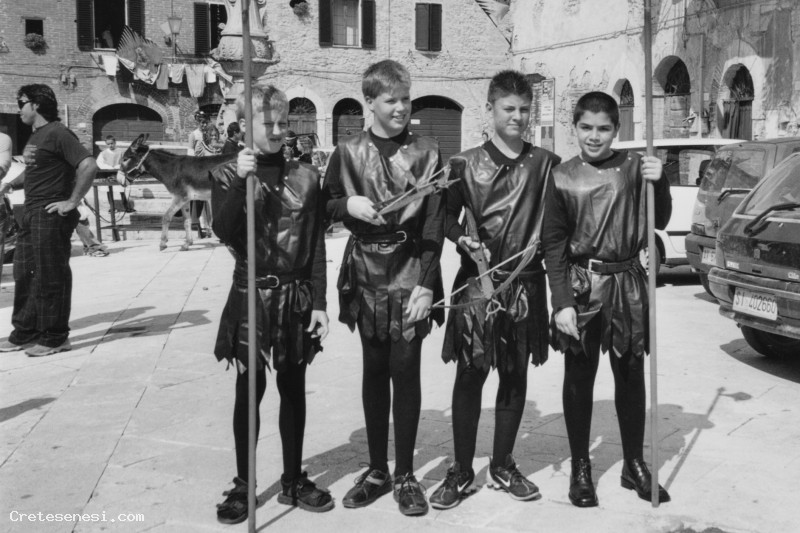 Gruppo di ragazzi vestiti da antichi soldati e pronti per il corteo storico antecedente il Palio dei Ciuchi.