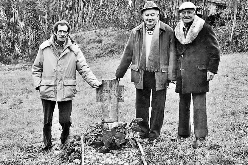 Un parente e due amici in visita alla tomba di Azelio Laschi, vicino ai Bagnoli, oltre la ferrovia, dove fu sepolto a seguito della sua uccisione per mano dei tedeschi.