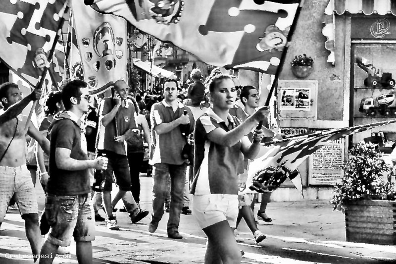 Dopo la vittoria del Palio straordinario del Giugno 2010, i contradaioi della Corona invadono piazza Garibaldi per festeggiare il grande risultato raggiunto.