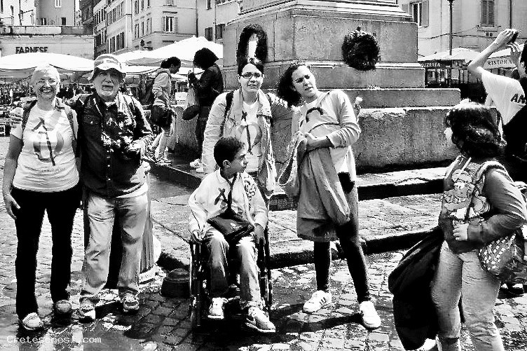 Curiosa foto di un gruppo di ascianesi in gita a Roma che si lascia ritrarre sotto la statua di Giordano Bruno a Campo dei Fiori.