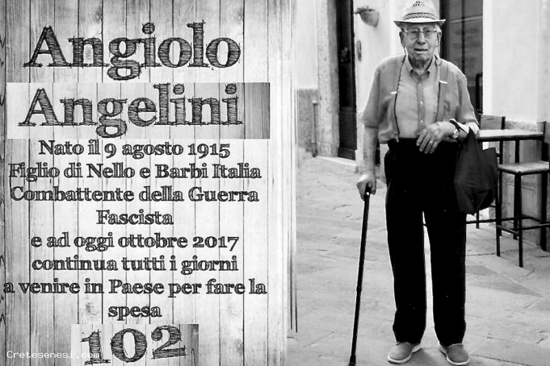 Angiolo Angelini, 102 anni compiuti il 9 Agosto 2017, continua tutti i giorni a venire a piedi in paese per fare la spesa. È vero che questo ultra centenario abita qualche centinaio di metri fuori dal centro storico, ma nel mondo di oggi nel quale si prende l'auto per andare al Bar quasi sotto casa, la sua è proprio un'eccezione.