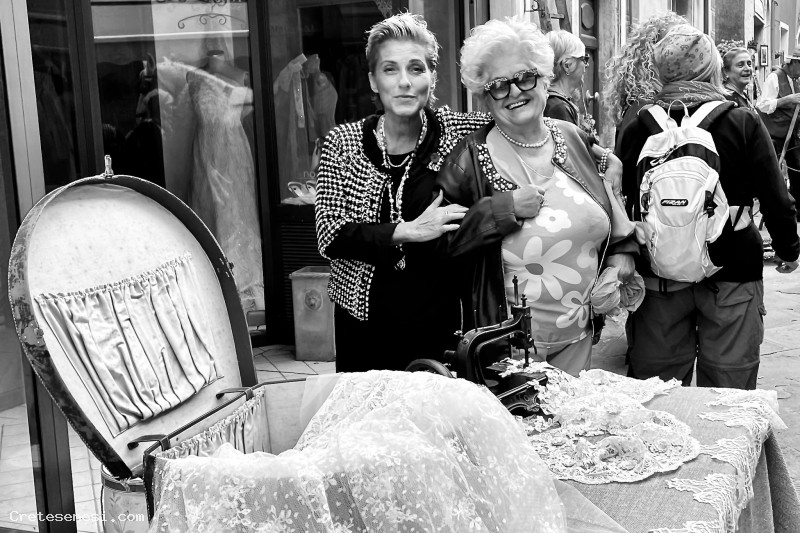 Stefania di Borgo Maestro e Anna Maraghini, sorprese in un momento di grande allegria di fronte all'allestimento sartoriale della Festa Contadina.