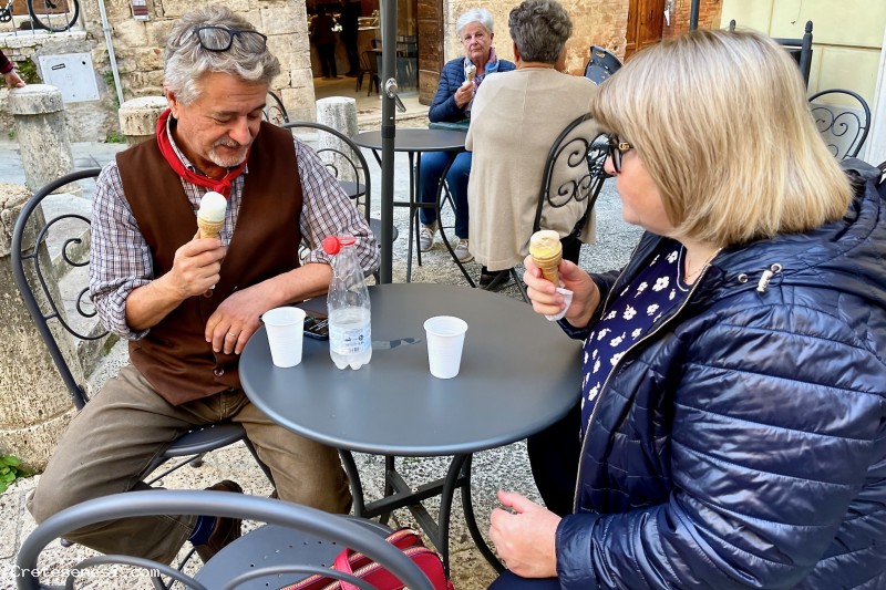 Giorgio Boccini, che ha curato buona parte dell'allestimento della Festa Contadina e coordinato l'attività dei figuranti, complice la moglie, ha trovato il tempo per addolcirsi la bocca con un gelato.