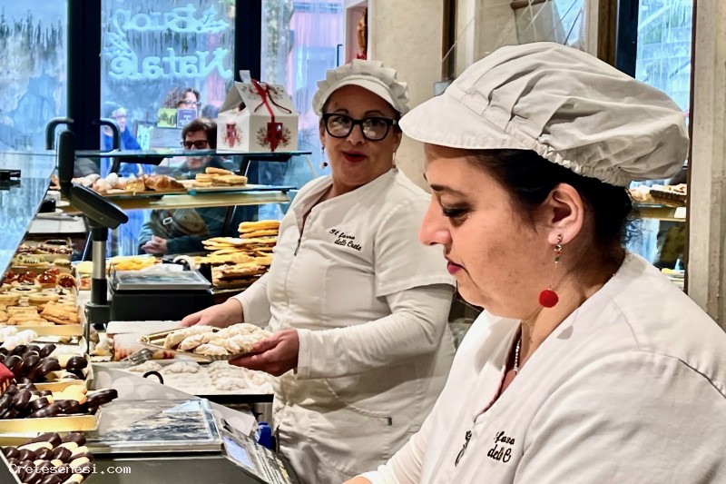 Stamani, al Forno delle Crete si respirava un atmosfera frizzante, non a causa dell'intenso fretto esterno, ma per un clima di festa che pervadeva tutto: una grande abbondanza di dolci, la gentilezza delle signore di là dal banco e l'ineccepobile loro trucco in clima Natalizio.