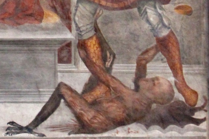 Sempre sul lato sinistro in basso, è presente una piccola figura inginocchiata, raffigurante un frate olivetano. Questa rappresentazione e le sue ridotte dimensioni, starebbero ad indicare che l’affresco fu dipinto su committenza olivetana, probabilmente in contemporanea alla realizzazione del ciclo di affreschi del Sodoma, dedicati alla vita di San Benedetto, fra il 1505 e il 1508. Affreschi che si possono ancora ammirare all’interno del chiostro maggiore di Monte Oliveto.