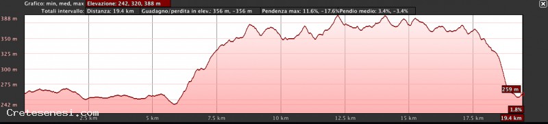 Percorso di limitata difficoltà caratterizzato da ampi tratti pianeggianti nella prima parte. La partenza è dal bivio di Lucignano d'Asso, dove si può tranquillamente parcheggiare, verso Torrenieri lungo la Cassia, percorso prevalentemente in pianura che segue il corso dell'Asso. Al bivio di Torrenieri, si gira a sinistra abbandonando il nuovo percorso della Cassia. Attraversato il ponte sull'Asso si inizia a salire affrontando una serie di tornanti. Al secondo bivio, si prende a sinistra per Bellaria, Celamonti e Cosona, percorrendo una strada bianca dalla quale si possono osservare splendidi paesaggi sia sul versante dell'Asso che su quello dell'Orcia. Da Cosona si prosegue attraverso un lungo giro per Lucignano d'Asso, splendido borgo medioevale. Dopo una possibile sosta ristoratrice nel locale i Bar-Alimentari, si scende rapidamente attraverso una serie di curve, per raggiungere il punto di partenza.