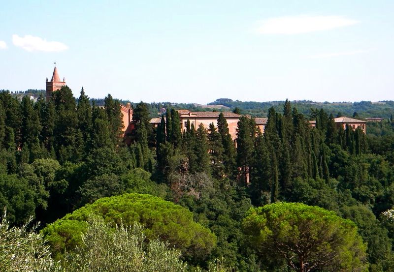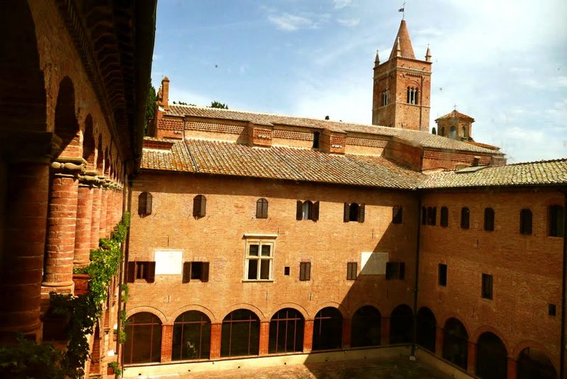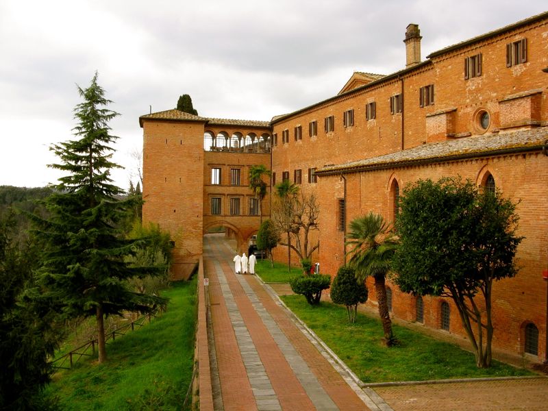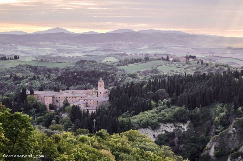 Fondato agli inizi del Trecento dal Beato Bernardo Tolomei nel luogo dove il senese si era ritirato precedentmente in eremitaggio, l'imponente complesso benedettino si trova nell'area meridionale del comune di Asciano, verde oasi ai margini del "Deserto di Accona", ovvero di una zona caratterizzata da ripidi ed aspri calanchi.