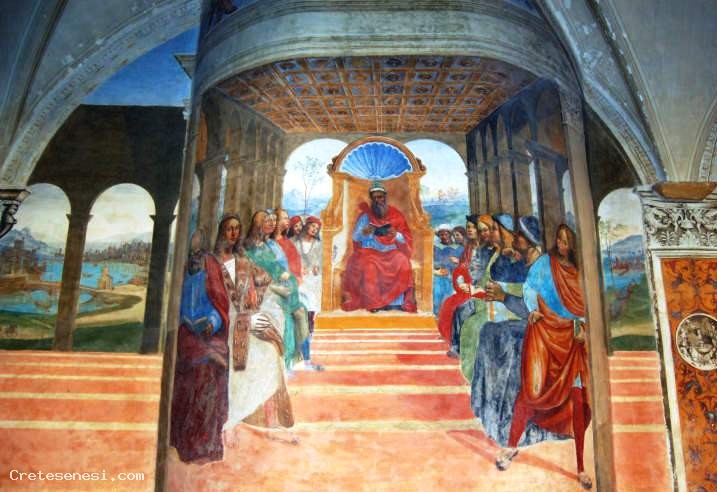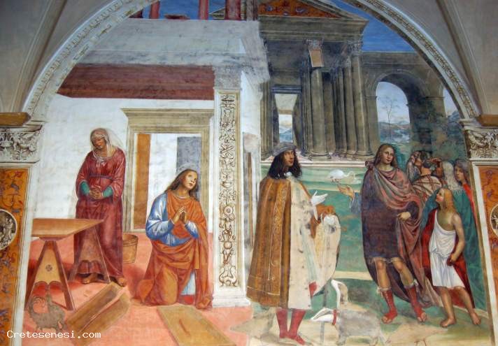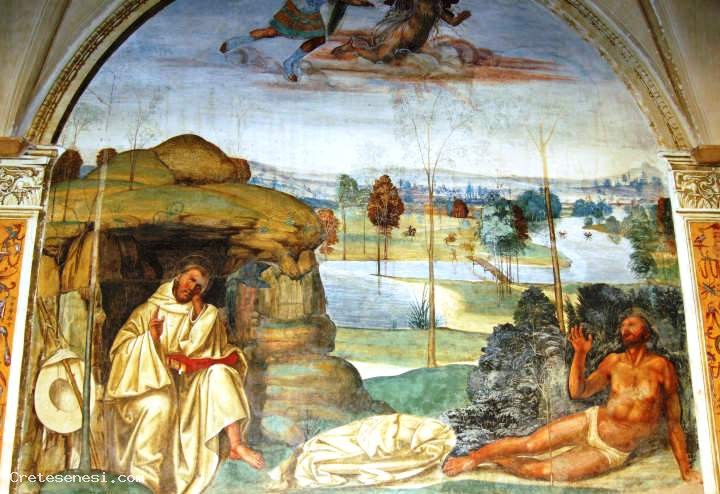 Gli affreschi attribuiti al Sodoma sono stati realizzati nell'arco di un triennio e sono considerati la massima espressione di maturità pittorica dell'artista. L'incarico gli venne conferito dai monaci Olivetani, dopo che per loro conto aveva affrescato, tra il 1503 ed li 1504, il refettorio del monastero di Sant'Anna in Camprena.