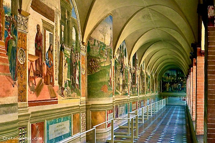 Il ciclo di affreschi che copre tutte le pareti del chiostro furono iniziati, prima dal Signorelli e completati dal Sodoma, in epoca successiva. Non è noto ad oggi il motivo per cui il Signorelli abbia abbandonato a metà quet'opera grandiosa. Si presume sia avvenuto per cogliere l'opportunità di commesse più prestigiose e forse meglio pagate.