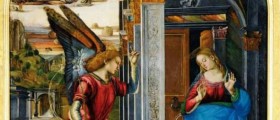 Commissionata al pittore nel 1490 per la cappella della compagnia della Vergine nella cattedrale di Volterra, venne terminata nel 1491, come certificano la data e la firma sul pilastro in primo piano. Si tratta di una delle opere più alte del periodo centrale di Signorelli ancora caratterizzato da asprezze disegnative e coloristiche ma forse per questo quasi una monade dall'algida bellezza. La vergine viene sorpresa dall'angelo in un portico e per la sorpresa lascia cadere a terra il libro che stava leggendo. Lo spazio invece di dilatarsi grazie alla prospettiva si comprime e verticalizza, in special modo nella corsa rapida dei pilastri e nel paesaggio sullo sfondo. La cromia dei marmi e delle vesti è tutta giocata su rossi, verdi e blu, fino ad arrivare alla nota raffinata e poetica delle piume di pavone dell'angelo. I panneggi quasi cesellati nel metallo creano tour de force sui corpi dei due protagonisti e l'occhio del riguardante si perde nella miriade di anfratti ombrosi creati dalle pieghe. Signorelli ripropone l'ambientazione tipica per l'Annunciazione dove inserisce i numerosi simboli mariani, dal pilastro alla porta aperta, dal ponte alla fortezza. Un bassorilievo con David che suona, incastonato sotto le volte del portico suggella la lettura mariana della scena. Olio su tavola, cm. 258x 190