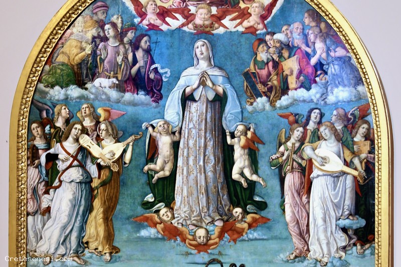 L'origine del modello iconografico di questa Vergine ascendente al cielo risiede nella mitica Assunzione dipinta da Simone Martini sulla parete dell'Antiporto di Camollia , di cui costituisce una variante rivisitata dalla sua epoca. Con un effetto di realismo ancora innovativo agli albori del XVI secolo, Girolamo di Benvenuto riprende la brillante invenzione di Simone grazie alla quale, attraverso il gioco di cerchi concentrici che organizzano la presenza degli angeli, dei santi e dei profeti testimoni dal cielo dell'arrivo della Vergine Maria tra loro, lo spazio sembra contenere i partecipanti e al contempo attrarre verso l'alto colui che è il protagonista principale dell'evento.