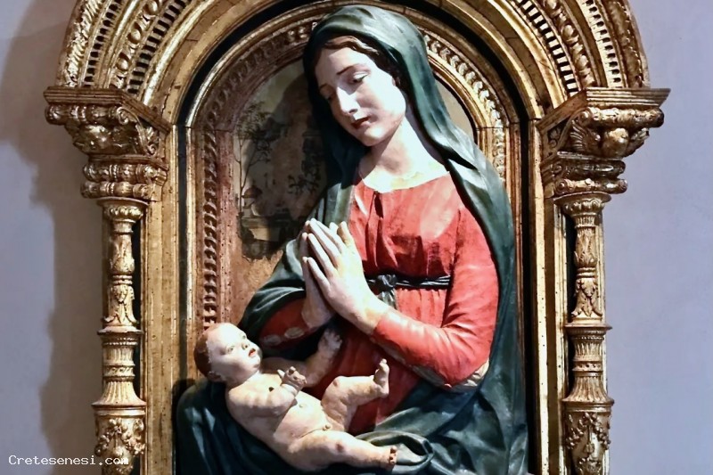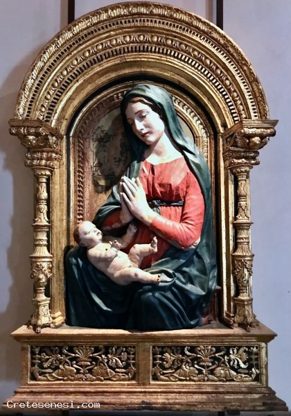 La combinazione fra cornice intagliata finemente, lo sfondo dipinto dietro il bassorilievo e la Madonna con bambino di tratto molto raffinato, hanno portato alla realizzazione di un prodotto artistico originale e di grande bellezza.